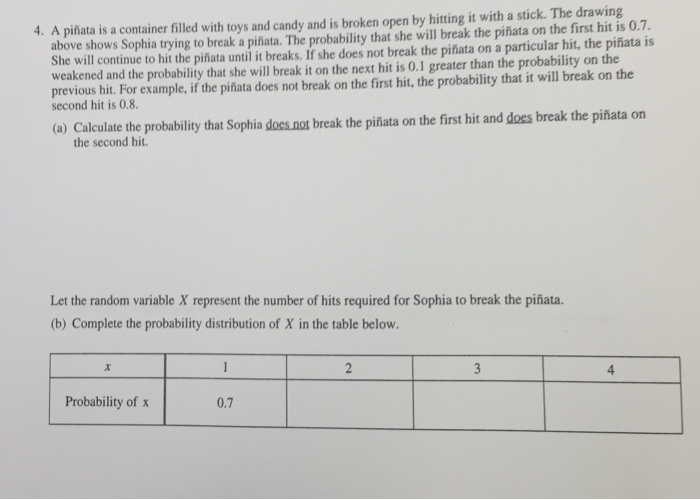 The probability model for X is shown below. She will continue to hit the pinata until it breaks. A Piñata Is A Container Filled With Toys And Candy And Is Broken Open By Hitting It With A Stick.